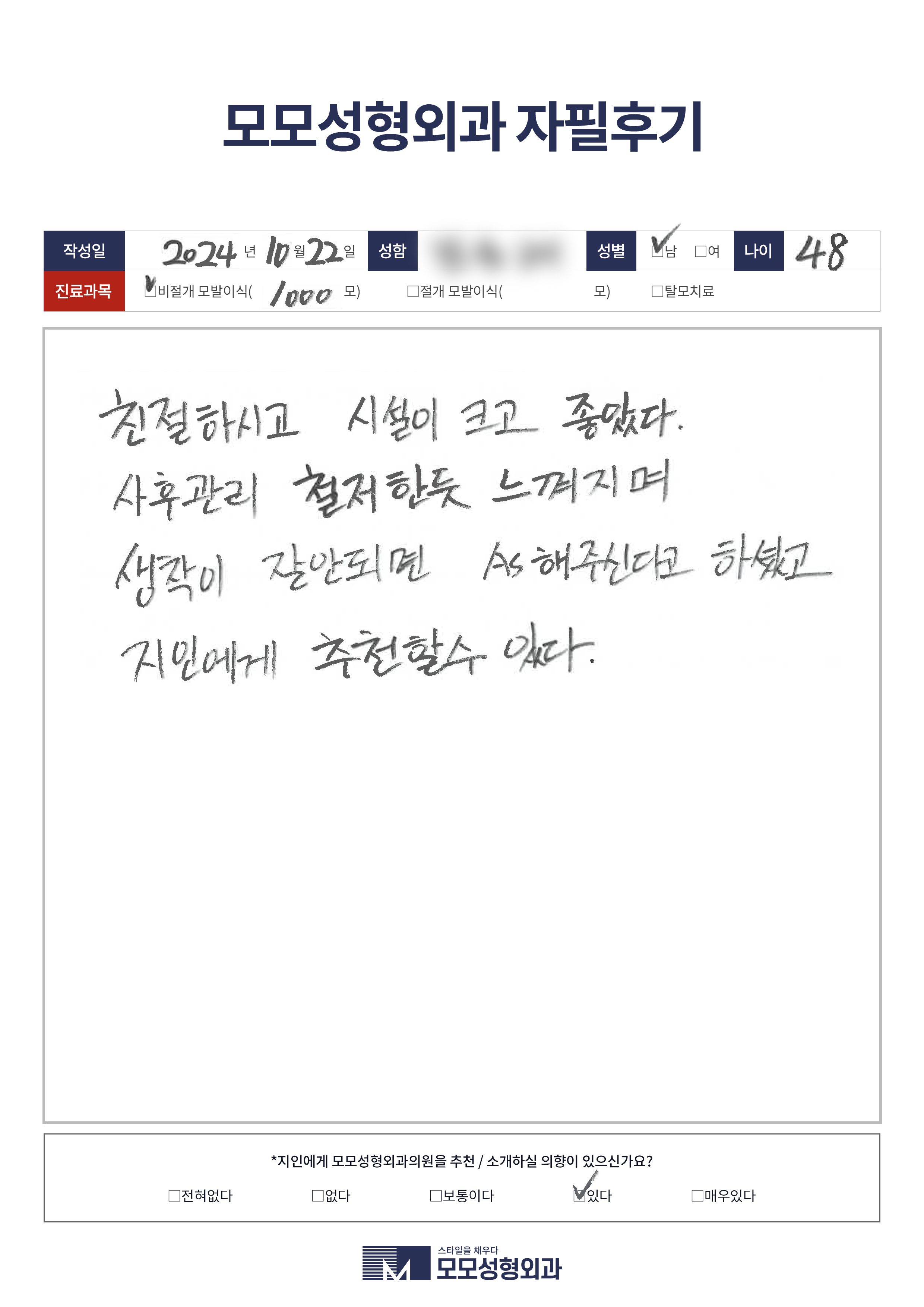 [40대]비절개모발이식1000모, M자이마
