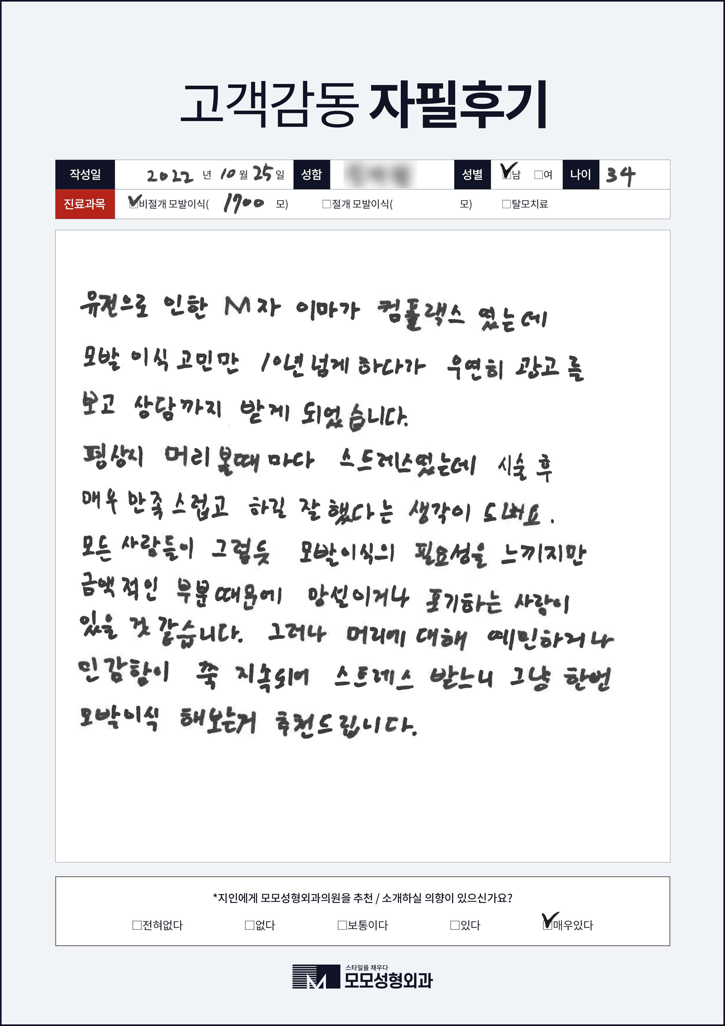 [30대]비절개모발이식1000모, M자이마