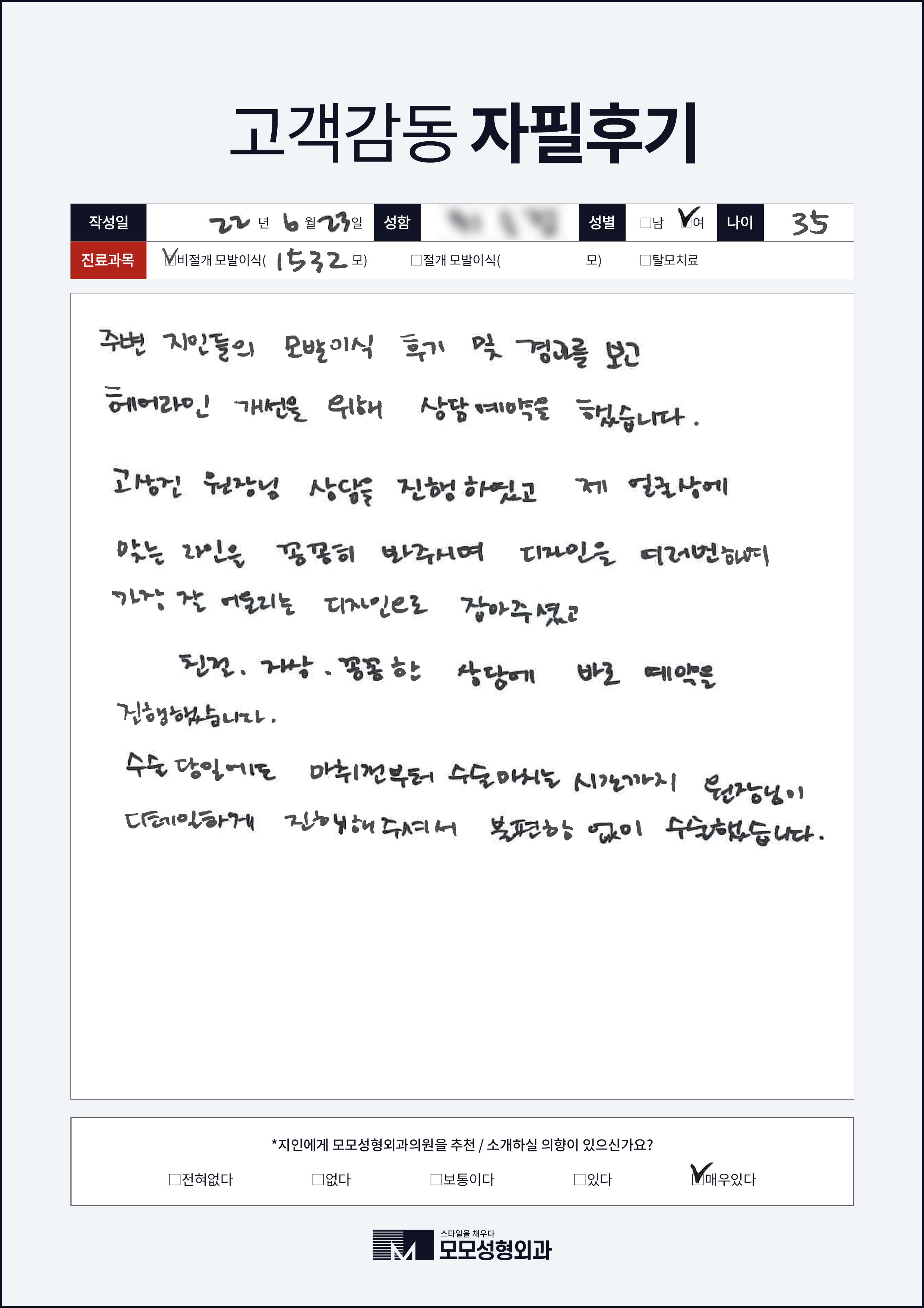 [30대]비절개모발이식1000모, 넓은이마