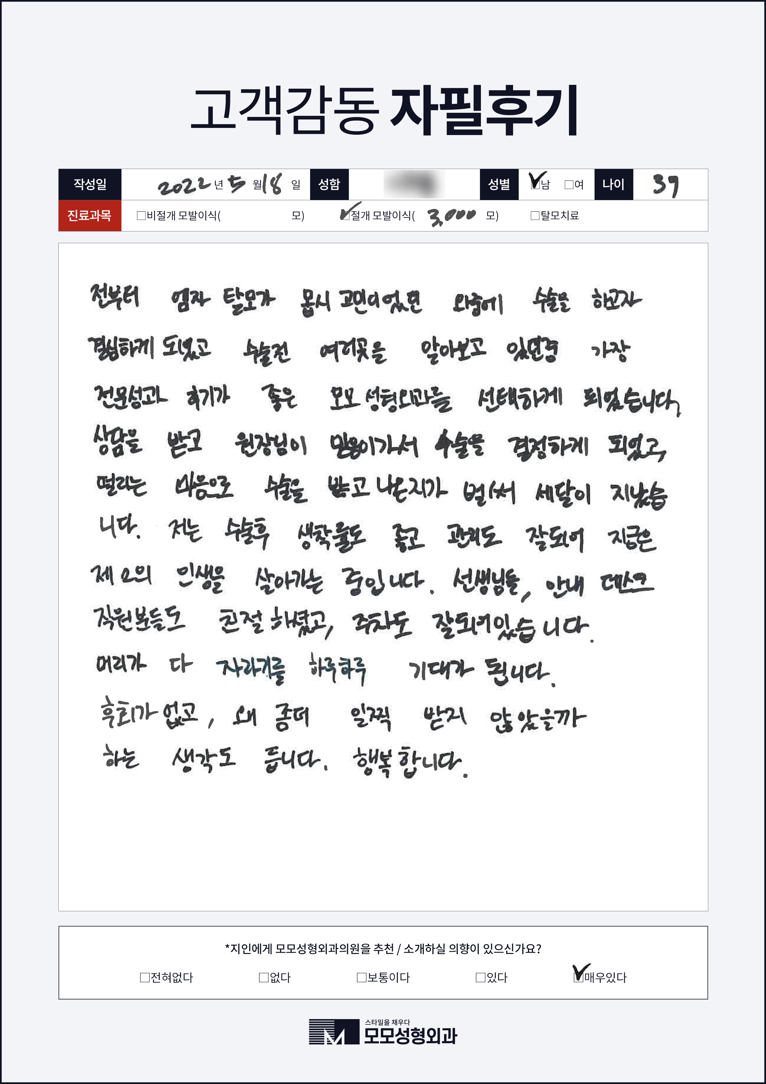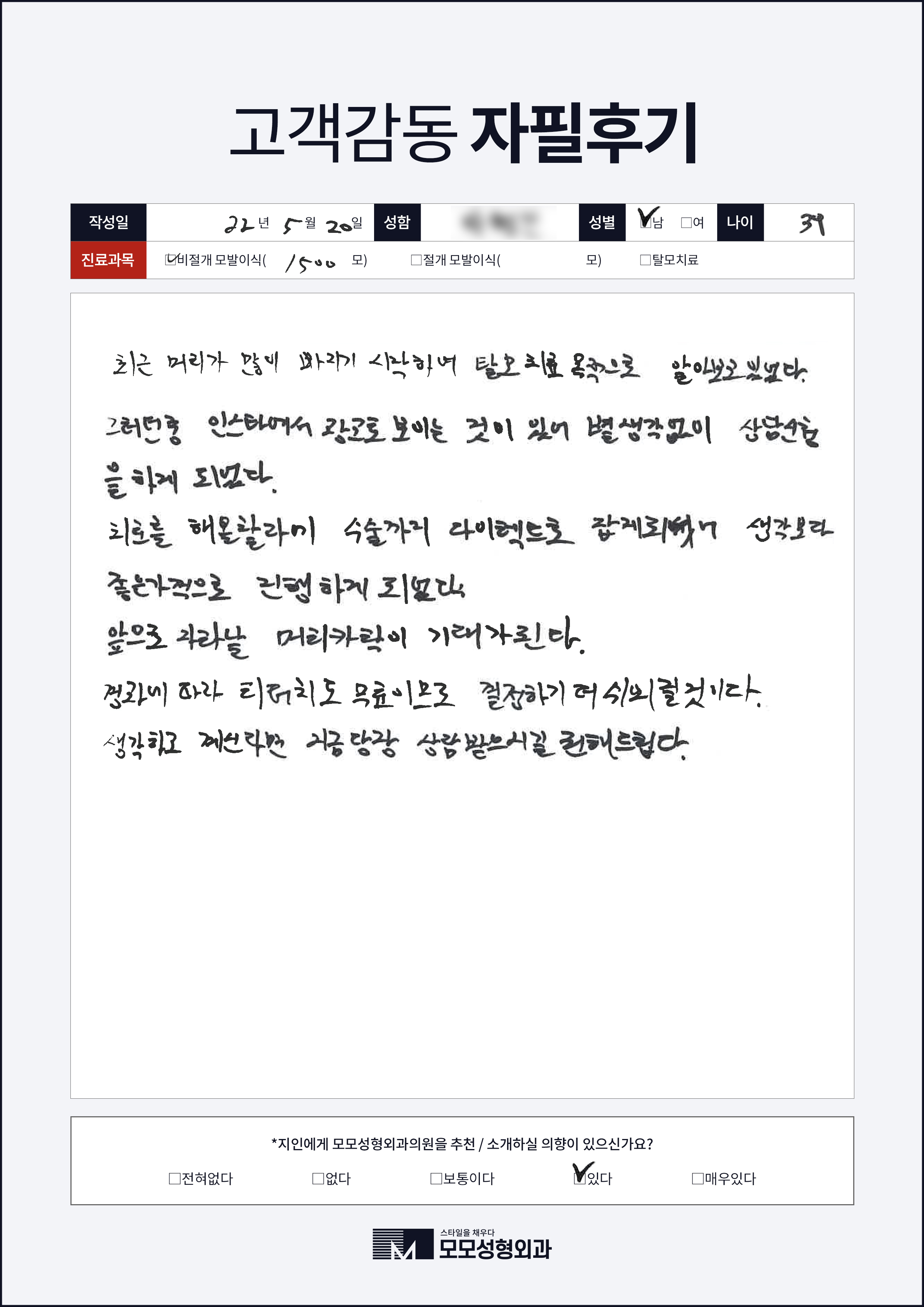 [30대]비절개모발이식1000모, 여러부위