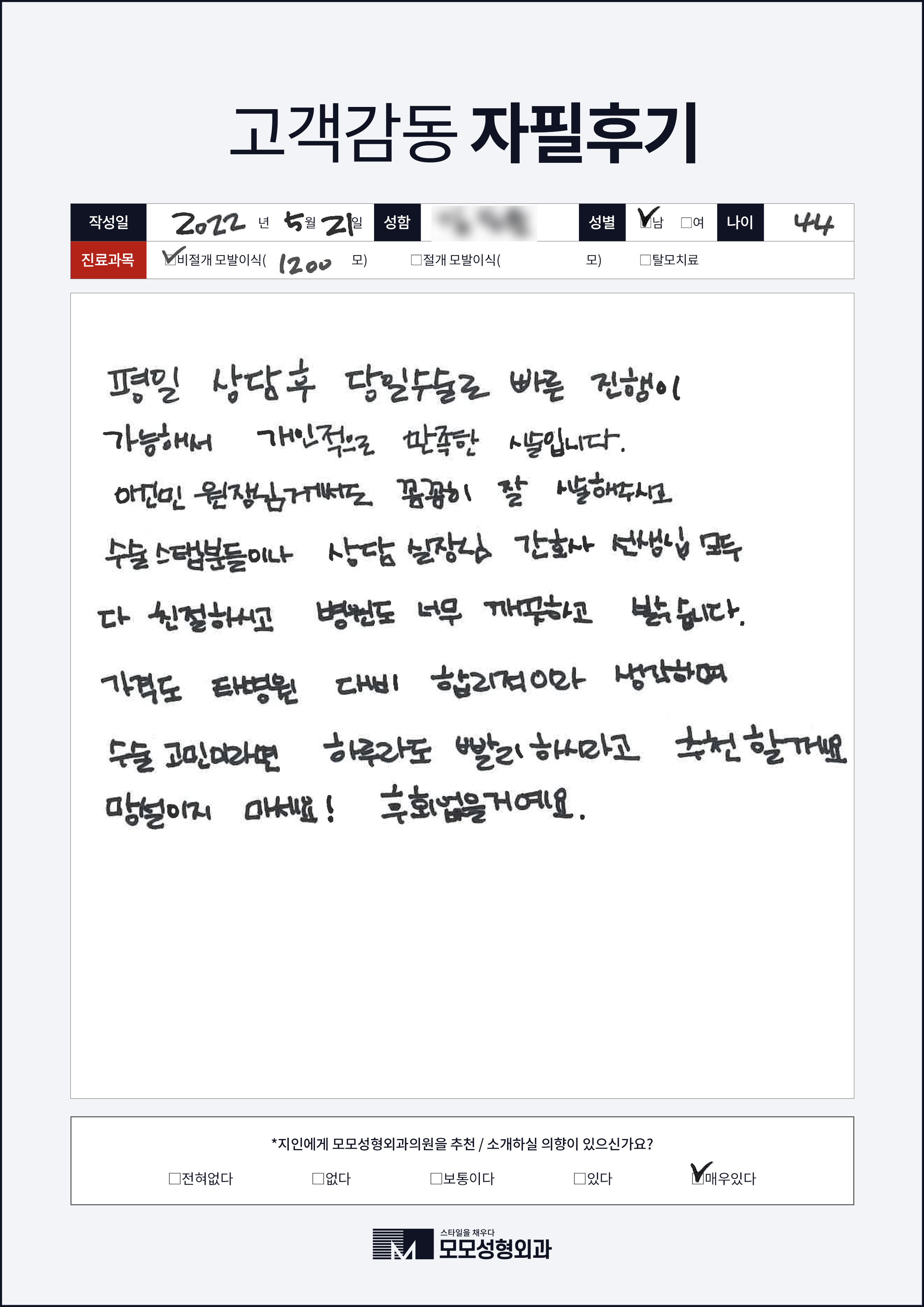 [40대]비절개모발이식1000모, M자이마