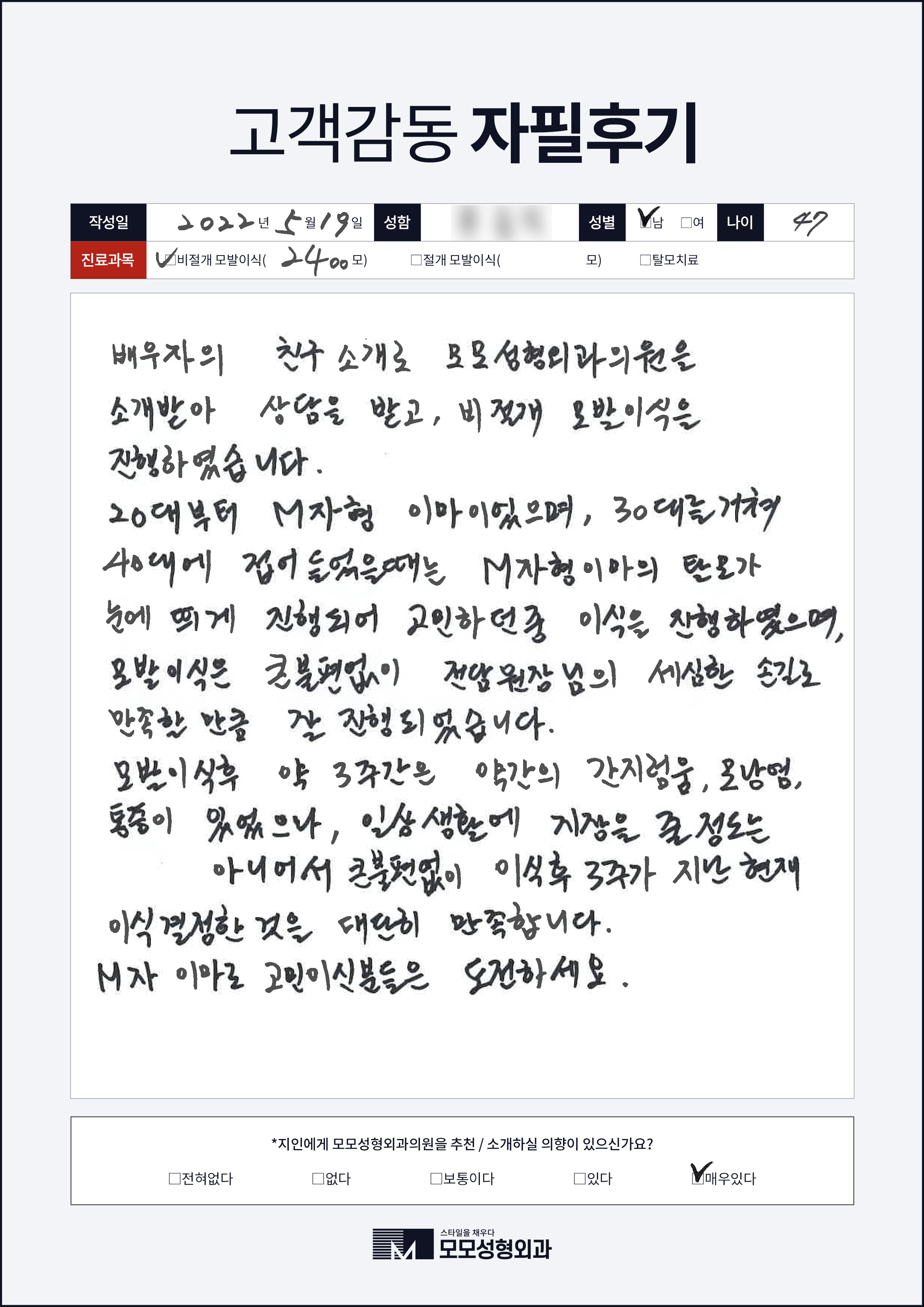 [40대]비절개모발이식2000모, M자이마
